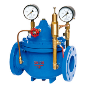 當閥門從進口端給水時,水流過針閥進入主閥控制室,出口壓力通過導管作用到導閥上。當出口壓力高于導閥彈簧設定值時,導閥關閉。控制室停止排水,此時主閥控制室內壓力升高并關閉主閥,出口壓力不再升高。 當閥門出口壓力降到導閥彈簧設定壓力時,導閥開啟,控制室向下游排水。由于導閥系統排水量大于針閥的進水量,主閥控制室壓力下降。進口壓力使主閥開啟。在穩定狀態下,控制室進水、排水相同,主閥開度不變,出口壓力穩定。 調節導閥彈簧即可設定出口壓力。